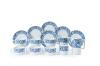 Juego para desayuno para seis servicios en porcelana de Bidasoa con decoración azul sobre fondo blanco.