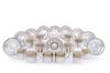Elegante diseño de ala con incrustación en oro y platino en triple cenefa con motivos vegetales en relieve. Se compone de: Pocillos en porcelana y monturas y platitos en plata de ley 925. Con dos pocillos extra.
