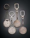 LOTE DE CUATRO LLAVEROS CON MONEDAS DE 5 PESETAS DE ALFONSO XII EN PLATA