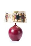 Lámpara de sobremesa en metal pintado en rojo, cuerpo globular y pantalla en beige con personajes.