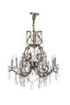 Brazos ondulantes recubiertos en cristal, con platillos, pandelocas, primas facetados, flores aplicadas y remate de esfera. Algunas pequeñas faltas.
