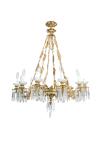 De doce brazos de luz, con decoración de hojas de parra y vides, pandelocas y prismas facetados.