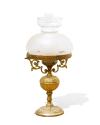Lámpara quinqué de sobremesa en bronce dorado con pantalla en cristal esmerilado y grabado.