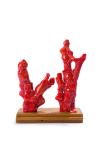 Lote de dos grupos de figuras orientales en coral tallado, sobre peana de madera.