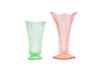 Uno de ellos en vidrio prensado color rosalina, el otro en verde con decoración de punta de diamante y boca rizda. Fábrica Brockwitz fundada en 1903, Dresde, Alemania.