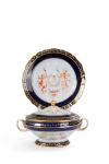 Formado por: sopera con plato en porcelana de Sévres con ala azul cobalto y marcas de "Chateau des Tuileries" con decoración de angelotes y plato en porcelana de Viena con campo decorado con escena galante, firmada "Seidl". Con marcas.
