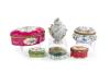 Lote en porcelana europea formado por cinco cajitas y un jarroncito con decoración esmaltadas de flores. Con distintas marcas.