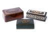 Lote formado por tres cajas, una en madera de raíz de sabina con marquetería e incrustaciones de madreperla, otra en maderas teñidas con decoración geométrica y otra en piel.