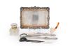 Lote para caballero formado por tintero en cristal tallado, lupa, cuatro abrecartas en metal, pipa y bandeja rectangular en plateado.