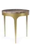 Mesa auxiliar circular con estructura de hierro con acabado en cuero cobre sobre tres patas estilizadas. Tablero de mármol violette. Diseño con inspiración en un botón de sensación volátil.