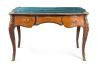 Mesa escritorio estilo Luis XV en madera, tres cajones en cintura de perfil sinuoso, patas cabriolé, tiradores, aplicaciones y sabots en dorado, tapete en piel verde.
