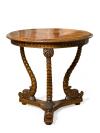Mesa velador alfonsina, S. XIX, en madera de nogal con decoración de escamas de pez. Sobre patas trípode torneadas terminadas en cabezas de delfín.
