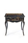 Mesita auxiliar estilo Luis XV en madera ebonizada con decoración de chinoseries con detalles en dorado y cajón en cintura.