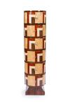 En madera chapada con decoración geométrica pintada. Presenta frente semicircular con 6 registros de cajones.