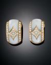 Realizados en oro amarillo de 18 K, formado por dos lineas de diamantes talla brillante con un peso aproximado de 1,88 cts, en diseño curvo conformados por centros de nácar.