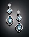 Realizados en oro blanco de 18 k, diseñados en tres cuerpos. El primero círculo con diamantes, segundo cuerpo con aguamarina en talla cuadrada orlada de diamantes en pavé, tercer cuerpo formado en motivo floral calado, con pavé de diamantes. Un peso total aproximado de 2,33 cts. Adorna el centro una aguamarina en talla lágrima, engastada en garras, con un peso total aproximado de 36,11 cts. Con cierres a presión.