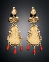 Realizados en oro amarillo de 18 k. diseño formado por medalla de la virgen del Rocio rodeada de pequeñas piedras incoloras, decorados con un lazo calado , terminando en lágrimas de coral rojo. Cierre Catalán