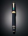 Pluma estilográfica realizada en resina negra chapada en oro de 14 k. Mecanismo retráctil mediante resorte, clip decorado con una esmeralda sintética.