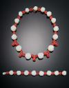 Realizada en oro de 18 k. Diseño formado por flores y hojas alternas en coral rojo y blanco engastado en garras, con un peso estimado de 20,90 gr. Diamantes talla brillante con un peso aproximado de 0.002. Una estimación de color y pureza: G-H/VVS1-VVS2.