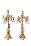 En metal dorado, con 7 brazos de luz y prismas facetados colgantes, fuste a modo de putti y decoración de motivos florales, patas en forma de volutas.