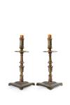 Pareja de candeleros antiguos en bronce dorado de fuste moldurado sobre base triangular de fuste moldurado sobre base triangular.