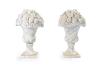 Pareja de copas de exterior en mármol blanco jaspeado con cuerpo gallonado rematadas en frutos.