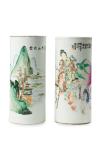 Pareja de jarrones altos en porcelana esmaltada con decoración de escenas y paisaje. Motivos epigráficos. China, S. XX.