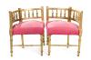 Pareja de sillas esquineras en madera tallada y dorada. Respaldos abalaustrados.