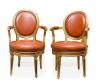 En madera dorada, respaldo en medallón, patas troncocónicas acanaladas y tapicería en cuero
