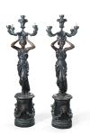 Pareja de torcheros en bronce pavonado con fuste de damas clásicas sosteniendo una pareja de candelabros de cinco luces. C. 1900.