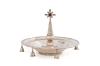 Plato limosnero en plata española punzonada. Decoración grabada de motivos vegetales con remate de cruz con cabujón. Campanillas perimetrales.