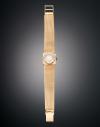 Caja y brazalete malla en oro rosa de 18 k, movimiento manual mecánico, caja cuadrada. Esfera dorada con numeración arábiga a las 12 y a las 6, y a trazos aplicados.