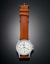 Caja circular en acero, pulsera en piel, esfera beige, numeración arábiga con trazos aplicados, agujas esmaltados en amarillo claro, sistema de movimiento cuarzo. Estado en marcha.