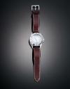 Caja circular, esfera gris plata, cristal de zafiro, pulsera en piel, sistema de movimiento automático, ventanillas para día y fecha a las 4, numeración arábiga, trazos aplicados. Estado en marcha.