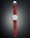 Reloj caja circular de acero, cronógrafo, con pulsera en cuero, esfera beige, numeración arábiga y trazos aplicados, esmaltada en negro. Estado en marcha.