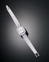Reloj joya Omega de señora, caja y brazalete texturizado en oro blanco de 18 k. Movimiento manual mecánico, caja rectangular con bisel en diamantes engastados en garras. Esfera plateada con numeración a trazos aplicados. Estado no esta en marcha.