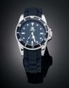 Caja en acero con bisel negro, pulsera en plástico, numeración de trazos aplicados en esmalte blanco, movimiento en cuarzo.