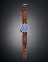 Caja circular en acero, esfera azul brillante, con dos índices dobles superpuestos a las 12 y 6, pulsera en piel, sistema de moviendo cuarzo. Estado en marcha