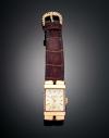 Caja rectangular en oro amarillo de 18 k, pulsera en piel, cierre en hebilla de oro de 9 k. Esfera dorada con numeración a trazos aplicados, sistema de movimiento manual mecánico. Serie: 624439. Estado en marcha.