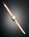 Realizado en oro de 9 k, caja cuadrada, esfera plateada, numeración de trazos aplicados en dorado y negro a las 12, 3, 6,9, movimiento manual, pulsera semi rígida con textura;  firmada por Rolex.