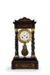 Esfera flanqueda por columnas torneadas con numeración romana y mecanismo cuerda a llave. Firmada.