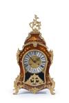Caja en maderera decorada con marquetería de maderas frutales y teñidas de motivos vegetales y florales. Esfera con numeración romana esmaltada. Mecanismo cuerda a llave. Con pendulo.