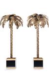 Decorativa pareja de grandes lámparas-palmera en latón dorado y pintado. Con base cuadrada en cristal negro y perfiles dorados.