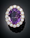 Realizada en oro blanco de 14 K, Diseño con cuarzo amatista central en talla oval engastada en garras con un peso estimado de 16 cts, orla diamantes en talla brillante con un peso aproximado de 4.00 cts, con una estimación de color y pureza: H-I/VS2-SI1.