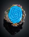Realizado en oro de 18 K, motivo rosa central en turquesa peso estimado 0.40 cts. Con diamantes peso aproximado de 2.51 cts, rubíes peso estimado 0.77 cts, granate tsavorita 0.07 cts.