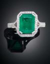 Realizado en oro blanco 18 K, motivo solitario con esmeralda en su talla engastada en garras con un peso estimado de 3,70 cts, diamantes engastados en grano en el contorno de la montura con un peso aproximado de 2,15 cts.