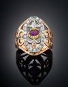 Realizado en oro amarillo de 18 k y vistas en plata. Diseño calado con centro en vistas de plata y rubí, orlado de diamantes talla rosa engastados en grano, con un peso total aproximado de 0,21 cts.