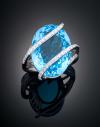 Realizado en oro blanco de 18 k, con topacio central en talla oval con un peso estimado de 22.47 cts. Diseño enriquecido por dos bandas de diamantes en diagonal, engastados en pavé con un peso aproximado 0.30 cts.