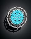 Realizada en plata, diseño calado en forma ovalada con centro en turquesa, grabada con motivos vegetales, engastada en garras; con un peso estimado de 0,78 cts. Rodeada de dos óvalos cuajados de diamantes, con un peso aproximado de 1,25 cts. Cierra el diseño separadores en diamantes negros.