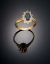 Realizada en oro amarillo de 18k, centro con zafiro talla oval y orla de diamantes talla brillante.